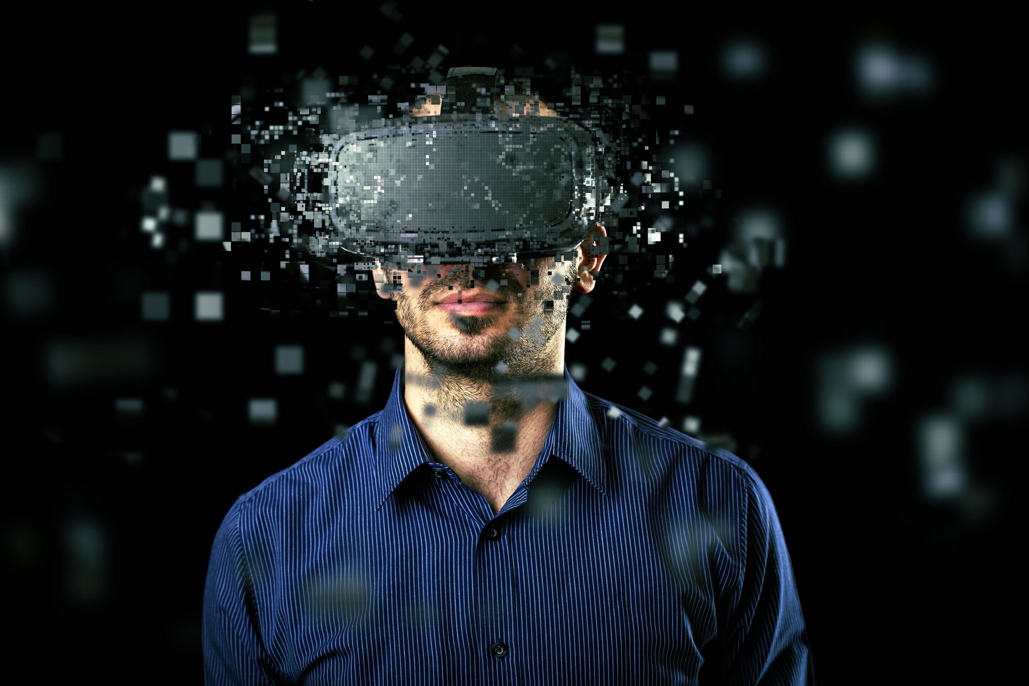 Man wearing virtual reality headset on dark background